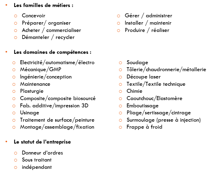 Nous avons dans le cadre de l’étude initiée une cartographie des métiers et compétences afin de mettre en valeur les savoir-faire des entreprises locales et favoriser les relations entre donneurs d’ordre et sous-traitants.